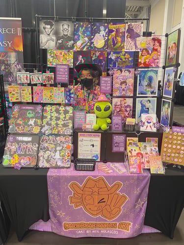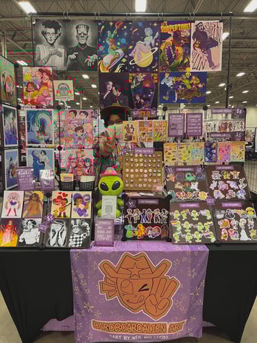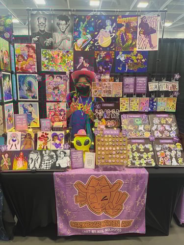 I’m Neil, the artist behind {Cardboardalien Art!} I’ve been vending at conventions, markets, and pop-ups since 2019. I sell a variety of prints, stickers and sticker sheets, pins, and more!